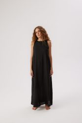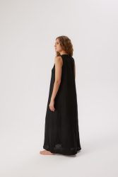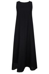 einfaches Leinenkleid für Frauen, mit Taschen, ärmellos und knöchellang. Das Kleid wird hinten mit einem braunen Kokosnuss-Knopf geschlossen, so dass man das Kleid leicht über den Kopf ziehen kann.