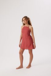 krótka sukienka o dopasowanym kroju z głębokim dekoltem na plecach. sukienka jest wiązana z tyłu na szyi oraz na plecach. dzięki wiązaniom dostosujesz głębokość dekoltu oraz długość sukienki. dodatkowe wiązania po bokach pozwalają na dopasowanie sukienki do obwodu w talii, są jednocześnie ciekawym detalem. sukienka posiada wycięcie w kształcie koła na przodzie, wiązane na górze.