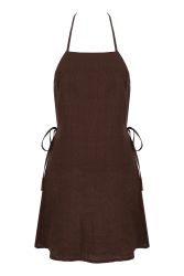 kurzes Kleid in tailliertem Schnitt mit tiefem Ausschnitt am Rücken. Das Kleid wird hinten am Hals und am Rücken gebunden. Mit den Bändern können Sie die Tiefe des Ausschnitts und die Länge des Kleides einstellen. Zusätzliche Bänder an den Seiten ermöglichen die Anpassung des Kleides an Ihren Taillenumfang und sind ebenfalls ein interessantes Detail. Das Kleid hat vorne einen kreisförmigen Ausschnitt, der oben gebunden wird.