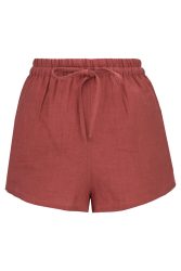 Kurze Leinenshorts für Damen mit eingenähten Taschen. Die Shorts haben einen elastischen Bund und einen Kordelzug im Bund, wodurch sie frei verstellbar sind.