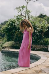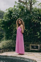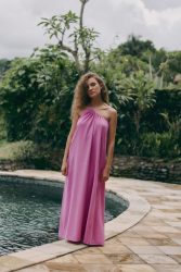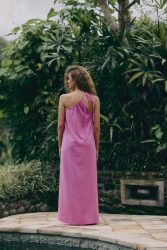 Das Kleid in einem rosa Farbton hat eine lockere Passform, das perfekte Sommerkleid. Es ist aus einer Mischung aus Leinen und Viskose gefertigt. Der Stoff ist leicht und luftig und bietet hohen Tragekomfort, besonders im Sommer. Das Produkt ist einlagig genäht und hat ein Stoffgewicht von 195 g/m2.