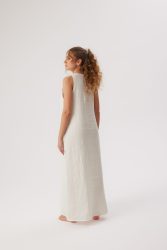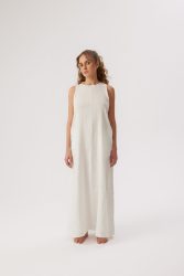 simple style linen dress for women, with pockets, sleeveless and ankle length. The dress is fastened at the back with a brown coconut button, making it easy to put the dress over the head.