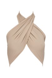 3. Wiązanie z tyłu – prosty przód przyłóż do biustu, wiązania trzymając pod pachami, mocno naciągnij i zawiąż z tyłu. Po przewiązaniu, popraw ułożenie na przodzie w biuście i pod biustem, może to konieczne, aby ułożyć top wyżej, ułóż materiał na biuście, mocniej naciągnij i jeszcze raz wykonaj wiązanie z tyłu.