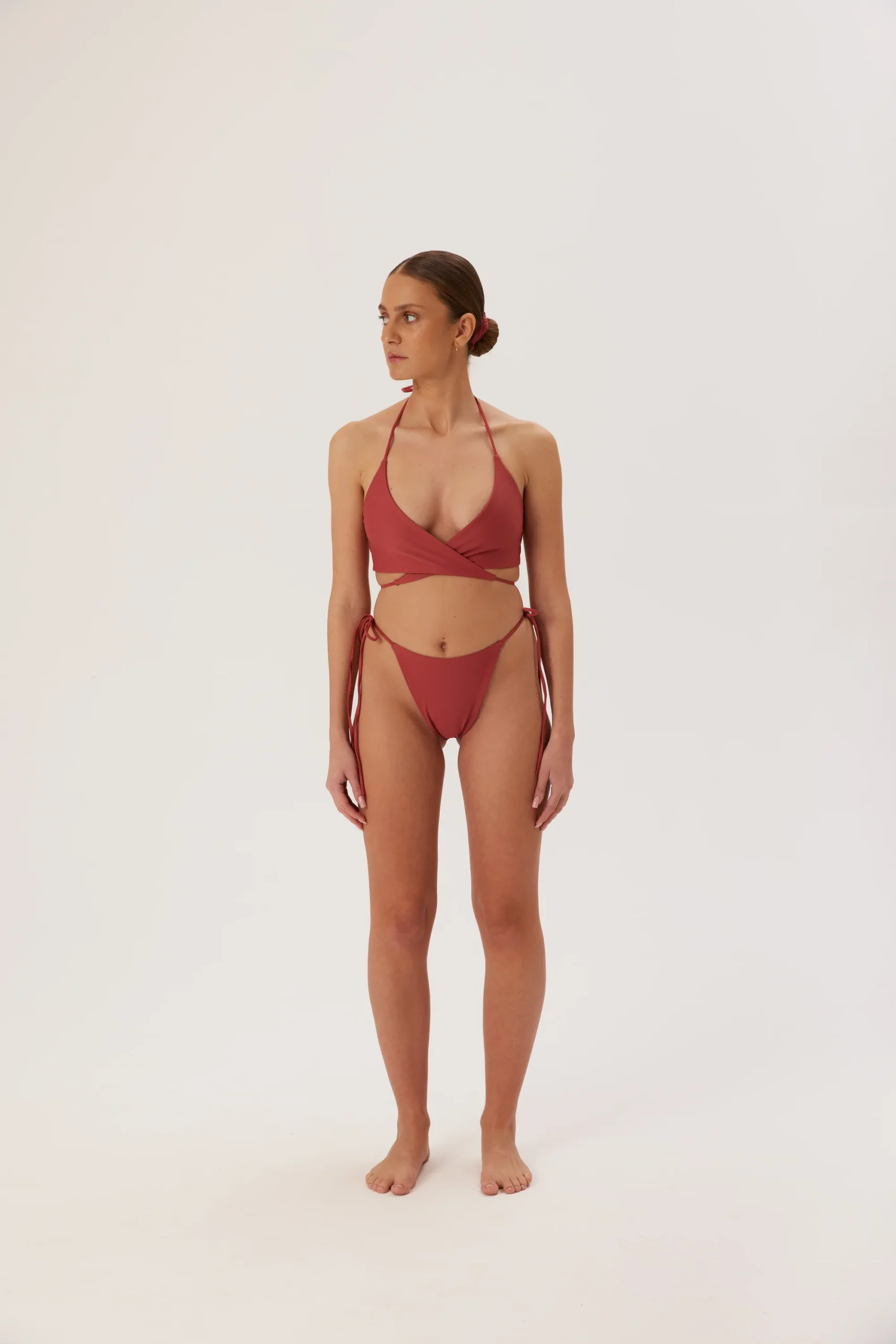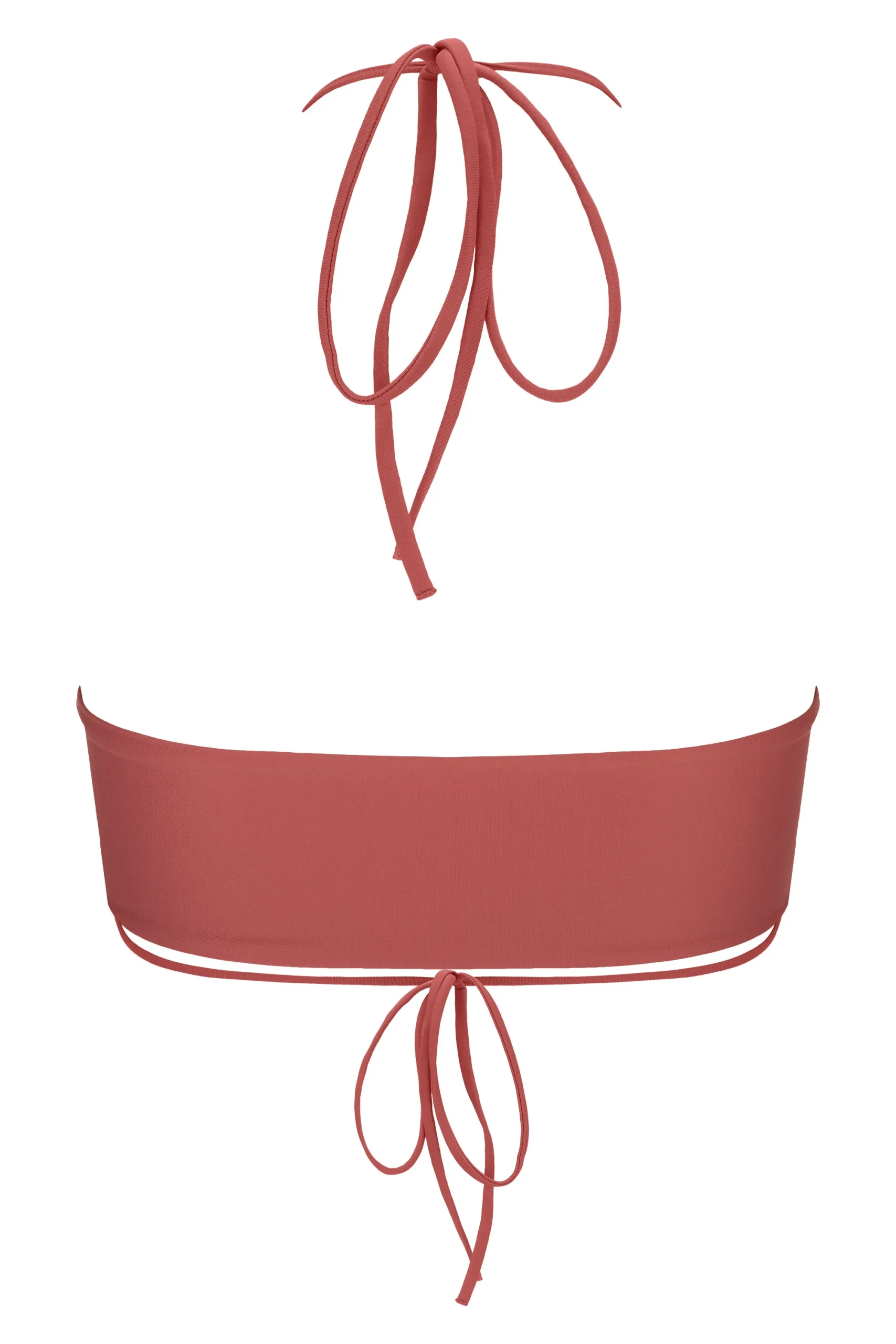 Wiązany top z kopertowym dekoltem. Strój wiązany z przodu na krzyż oraz na szyi za pomocą cienkich sznurków, z prostym tyłem.