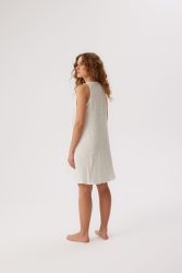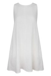 prosta w formie lniana sukienka dla kobiet, z kieszeniami, bez rękawów o długości do kolan. sukienka jest zapinana z tyłu na brązowy, wytworzony z kokosa guziczek, co ułatwia wkładanie sukienki przez głowę.