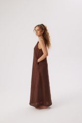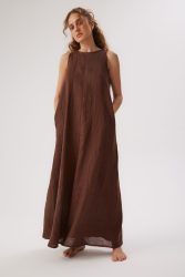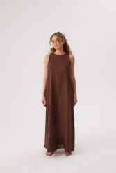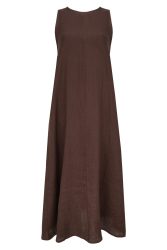 prosta w formie lniana sukienka dla kobiet, z kieszeniami, bez rękawów o długości do kostek. sukienka jest zapinana z tyłu na brązowy, wytworzony z kokosa guziczek, co ułatwia wkładanie sukienki przez głowę.
