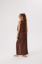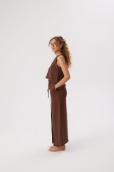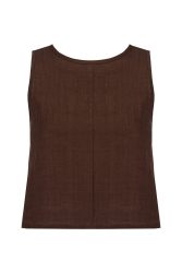 prosta w formie lniana bluzka dla kobiet, średniej długości, bez rękawów. bluzka jest zapinana z tyłu na brązowy, wytworzony z kokosa guziczek, co ułatwia wkładanie bluzki przez głowę.