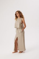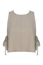 lniana bluzka dla kobiet, średniej długości, bez rękawów, wiązana po bokach. wiązania nadają bluzce ciekawą formę. wiązanie można odpowiednio regulować i dopasować do obwodu w biuście. bluzka jest zapinana z tyłu na brązowy, wytworzony z kokosa guziczek, co ułatwia wkładanie przez głowę.
