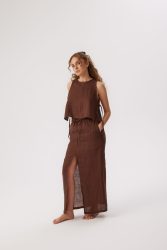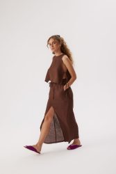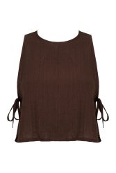 lniana bluzka dla kobiet, średniej długości, bez rękawów, wiązana po bokach. wiązania nadają bluzce ciekawą formę. wiązanie można odpowiednio regulować i dopasować do obwodu w biuście. bluzka jest zapinana z tyłu na brązowy, wytworzony z kokosa guziczek, co ułatwia wkładanie przez głowę.