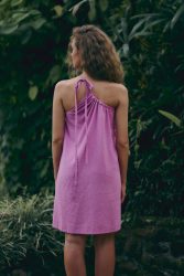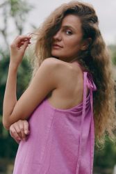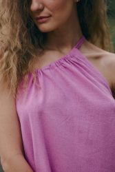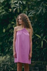 Sukienka w różowym odcieniu ma luźny krój, to idealna letnia sukienka. Jest wykonana z mieszkanki lnu z wiskozą. Tkanina jest lekka i przewiewna, zapewnia wysoki komfort użytkowania, zwłaszcza latem. Produkt jest szyty jednowarstwowo z tkaniny o gramaturze 195g/m2.