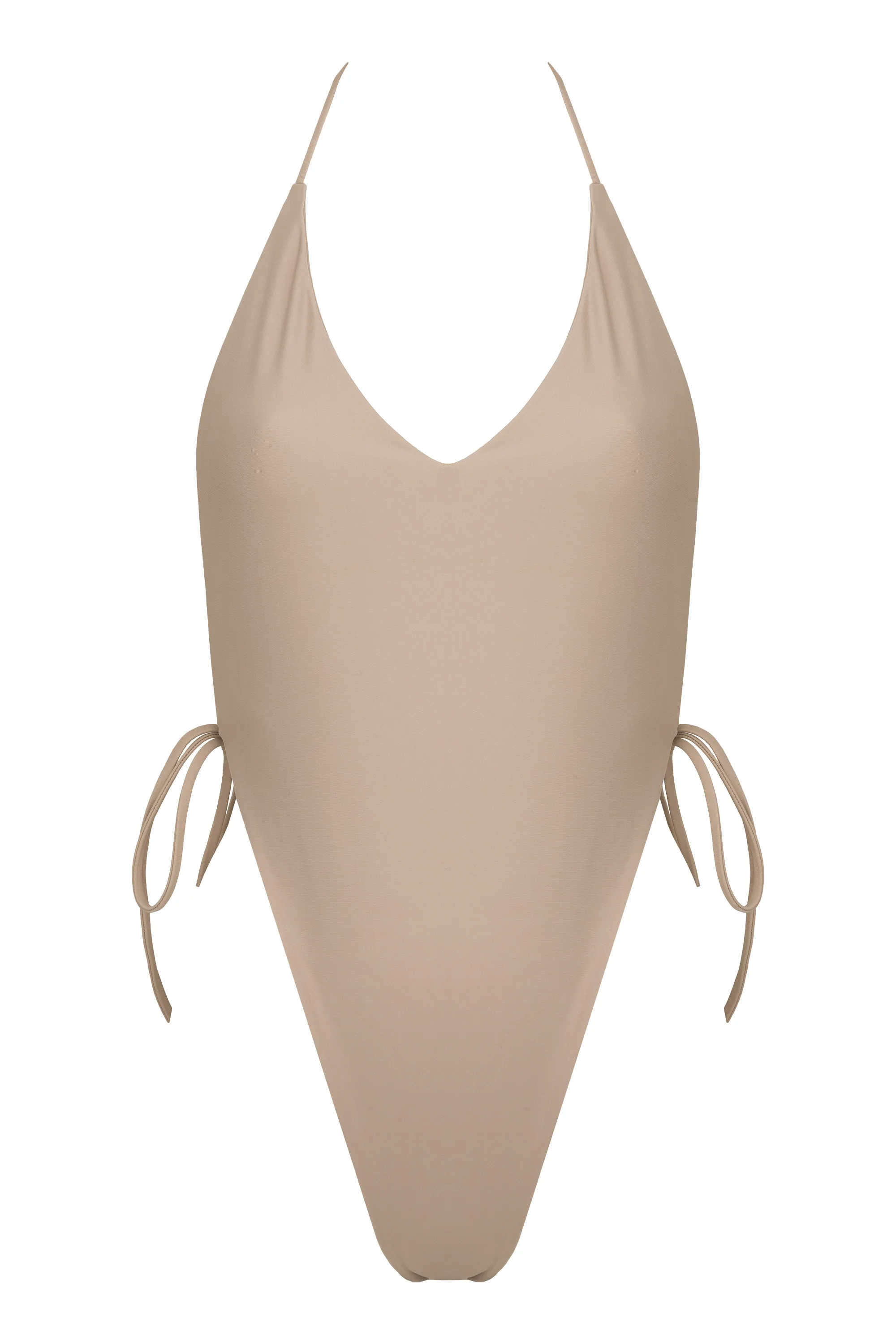 Jednoczęściowy kostium kąpielowy o minimalistycznej ponadczasowej formie z dekoltem w szpic z przodu i głębokim wycięciem z tyłu. Kostium wiązany jest z tyłu na szyi i po bokach. Forma kostiumu ekstremalnie wydłuża nogi, nadaje sylwetce kobiecości, wysmukla.